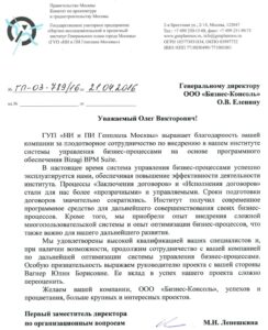 В благодарственном письме отмечается высокая квалификация специалистов Бизнес-Консоль, благодаря которому компания повысила управляемость ключевых бизнес-процессов, сократила сроки подготовки договоров, приобрела опыт и инструменты оптимизации и автоматизации бизнес-процессов.