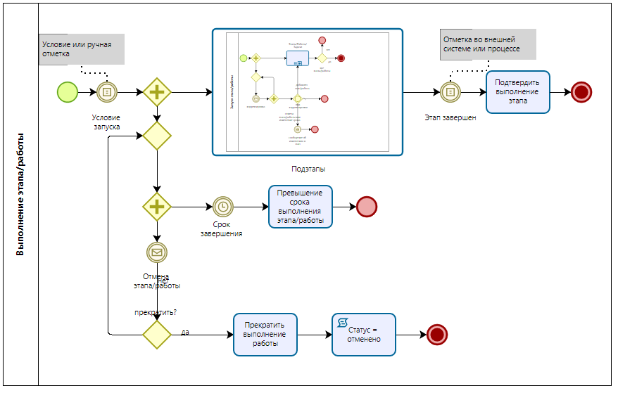 Мы смогли решить обе эти проблемы, реализовав рекурсивный запуск этапов и работ, что позволило создавать уровни и подуровни любой глубины, добавлять этапы и работы и вносить изменения в уже запущенные. И речь идет не о кодировании, а о схеме процесса. Мы сделали это средствами BPMN. Второй секрет успеха – в модели данных, которая позволяет реализовать такой процесс. Таким образом уникальной в нашем решении является модель процесса (схема+модель данных). Ниже приведена схема общего процесса управления проектом и схема выполнения этапов и работ.